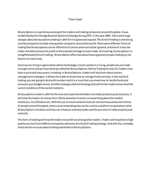 Binary Options Affiliate Programs. By getting started with an affiliate program for binary option trading, you can begin to realize your goals for trading profitably and effectively. Becoming a binary options affiliate is as simple as helping to drive web traffic to sites for binary option trading by adding a link to the site on your own site. Binary options trading focuses on short-term price changes for various assets, allowing traders to speculate on whether the price will move up or Binary option down in a set time period, typically between an hour or less and up to a full week. How Binary Options Trading Affiliate Programs Work. Binary options trading affiliate programs are a great way to make more money from your usual internet advertising endeavors. The key is forming the right partnership to fill your needs and meet your goals. Finding the right affiliate program is the most essential step for your success. The right program can make all the difference in your profits. Because binary options trading often draws traders who are interested in trading a variety of assets, affiliate marketers are already appealing to individuals who prefer diversified offerings. This means it is fairly simple to drive traffic to binary options trading sites and earn extra income by getting involved with the right binary options trading affiliate program. Recommended Binary Option Robot: Why You Should Promote Binary Options. Over the last several years, binary options trading has overtaken forex trading in popularity. Forex trading used to be the cutting edge of internet-based trading, but this is no longer the case, as binary options trading has forced a shift in market focus from one to the other. Binary options trading has gained popularity due to its simplicity and the ease with which a trader can get involved in the binary options trading market. The outlook for binary options trading is bright and there does not appear to be any indication of lost popularity. The binary options trading market is also incredibly accessible. It’s available for anybody wanting to get into trading and often, brokers do not require a large initial deposit to set up an account and get started trading. Binary options trading offers traders the ability to increase their investment capital with different welcome bonuses and bonuses for re-deposited funds. There is no need for traders to download trading platforms because everything is based on the internet, making conversions much easier. Binary options trading is accessible to nearly any traders, either advanced or novice. Benefits of Becoming a Binary Options Trading Marketing Affiliate. Binary options trading appeals to a large array of different sorts of traders; both those who have traded extensively and those who have never traded at all are equally drawn to the ease and availability of binary options trading. Many binary options trading affiliate programs have only been operating for a short time, but have already exhibited strong successes on increasing returns for affiliates. As binary options trading continues to gain popularity, the opportunities for affiliates to share in the upcoming successes also grow exponentially. Affiliates will continue to see an increase in the interest surrounding binary options trading. As it becomes more well-known, more people will want to learn what it’s all about. That curiosity will allow affiliate marketers to drive web traffic in an ever-increasing flow to the binary options trading sites they’ve linked to, increasing the visibility of the trading site and the profits of the affiliate marketer. By becoming a binary options trading marketing affiliate, you’ll increase the amount of money you earn jut be driving traffic from your own site to that of a binary options trading broker. Being an affiliate requires very little from you and offers huge earning potential. How to Earn as a Binary Options Trading Affiliate. Your earnings as a binary options affiliate are dependent on the commission plan you choose. The most popular commission plans include: The CPA or Cost Per Acquisition Plan – This commission structure works in the same way as other commission structures, except that it is intended to give rewards to affiliates who refer high-quality traffic, as well as high-frequency traffic. Affiliates using the CPA structure will receive higher rates when referrals make higher deposits. The Revenue Share Plan – This commission structure is based on net revenues generated by the clients you refer. When your referrals trade more often, the revenue they generate for you is higher. In general, when total revenue is under $10,000, you earn 25% commission. For generated revenues between $10,000 and $50,000, you’ll earn 30% and at levels exceeding $50,000, you earn 35% commission. One of the most important benefits of the revenue share plan is that so long as your referral continues to make trades, your income stream is not interrupted. This makes the revenue share plan an excellent way to generate passive income streams due to the long-term commitment of most binary options traders. The Hybrid Plan – As its name suggests, this plan incorporates the best features of both the cost per acquisition and revenue share plans. This commission allows you to not only earn upfront payments as in the CPA plan, but also allows you to keep earning a passive income stream from your referred traders. In Summary. Becoming a binary options trading affiliate is a good way to realize higher profits and generate the best returns from your internet marketing endeavors. It’s an excellent way to generate income simply by placing a referral link for a binary options trading site on your own site and driving high-quality and high-frequency traffic to your partnered site. It’s a very good tool for ensuring you’ve got some support when trading on the binary options market because you’ll have access to an unmatched system of support, comprise
