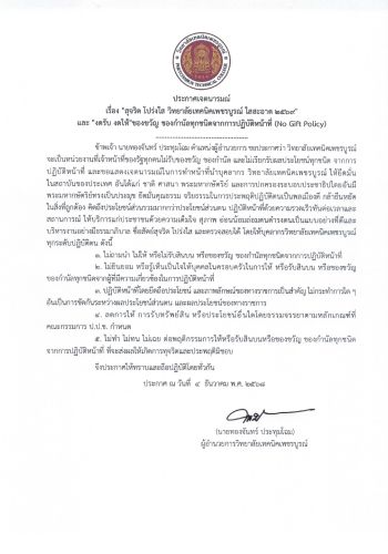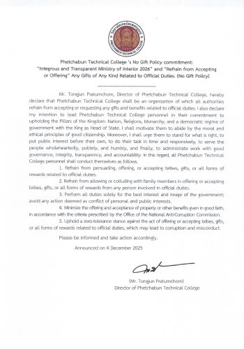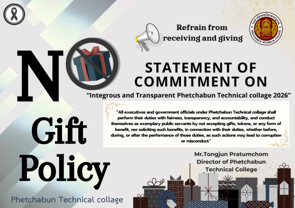 เรื่อง"สุจริต โปร่งใส วิทยาลัยเทคนิคเพชรบูรณ์ ใสสะอาด ๒๕๖๙ และ "งดรับ งดให้" ของขวัญ ของกำนัลทุกชนิดจากการปฏิบัติหน้าที่ (No Gift Policy)
